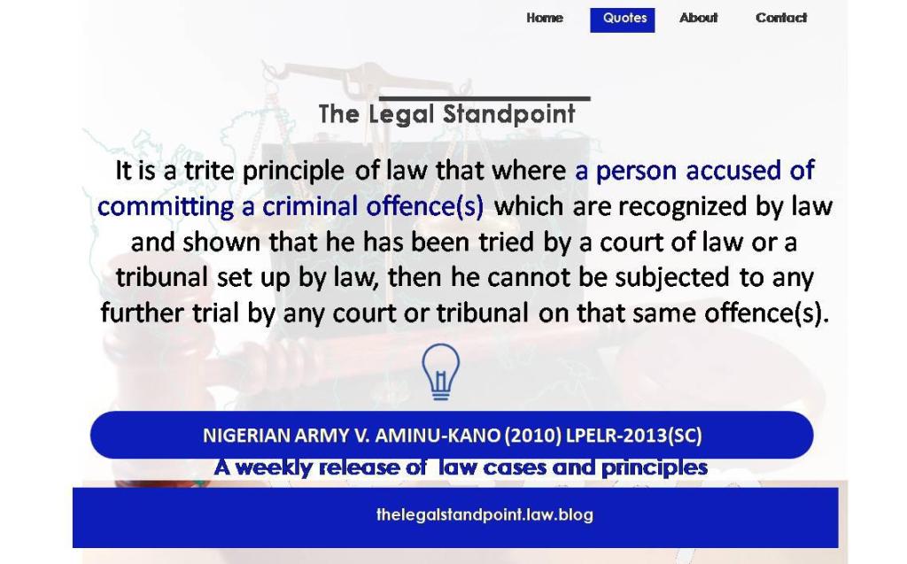 S.36(9) of the Constitution provides thus: No person who shows that he has been tried by any court of competent jurisdiction or tribunal for a criminal offence and either convicted or acquitted shall again be tried for that offence or for a criminal offence having the same ingredients as that offence save upon the order of a superior court. The rationale for this doctrine is the protection of the individual from the oppressive tendencies of the state, which, with its vast resources can perpetually deprive an individual his personal liberty through several frivolous trials. The doctrine is a universal concept in criminal law jurisprudence. This also received judicial pronouncement by Black J, of the Supreme Court of the United States in Green v United States (1957) 355 U.S 184, at 187-8.