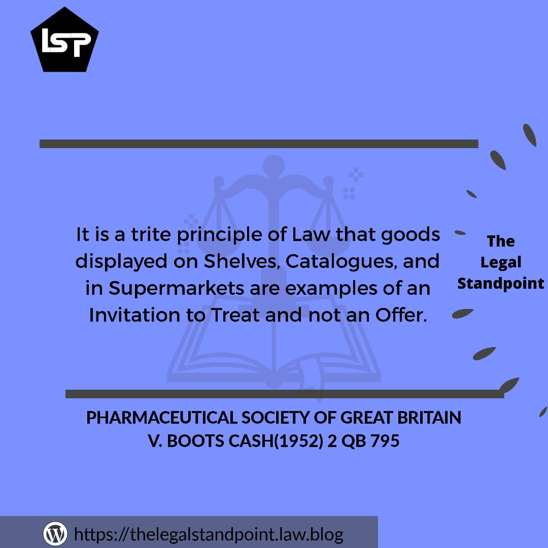 Generally in law, displays of goods in a supermarket, catalogues, shelves, etc are examples of an Invitation to Treat. In Pharmaceutical Society of Great Britain v Boots Cash(1952) 2 QB 795, it was held that goods displayed in a chemist store are examples of an Invitation to Treat. The Offer comes into play when the buyer takes the goods to the cashier. The cashier can then decide to accept or reject the offer. See also Fisher v Bell(1961) 1 QB 394. Other examples of an Invitation to Treat are auctions, advertisements, a call for interviews, etc.