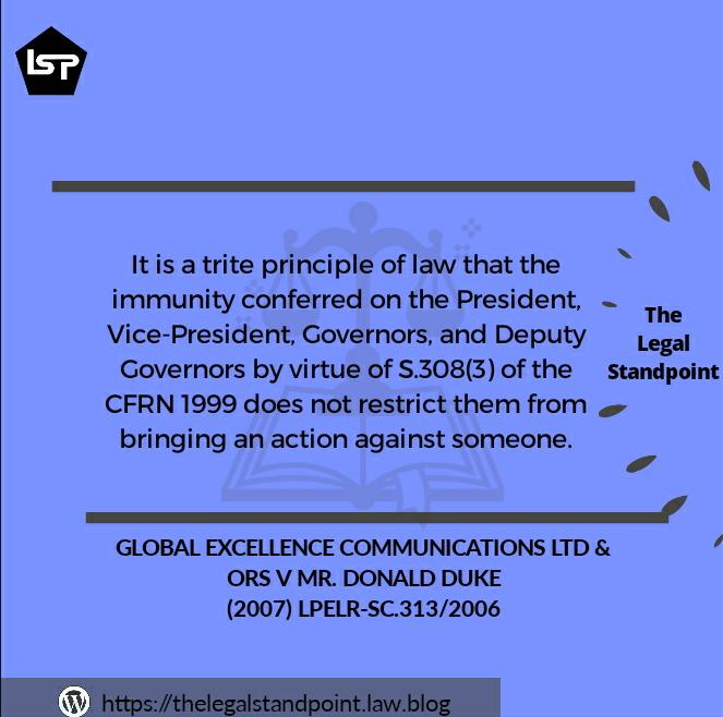While giving the lead judgment, Onnoghen JSC (as he then was) held that: ‘from the words used by the framers of section 308 of the 1999 Constitution, it is clear that their intention is explicitly to confer absolute immunity on the respondent and the others therein mentioned without a corresponding disability on them to the exercise of their rights to institute actions in their personal capacities in any relevant court of law for redress during their tenure of office, as in the instant case.