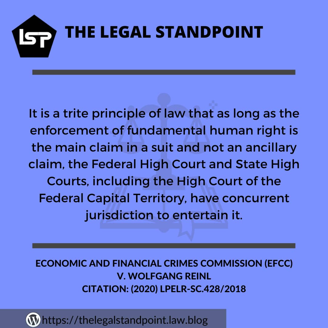 In conclusion, the position of law is that irrespective of the parties involved, as long as the enforcement of Fundamental Human Rights is the main claim, the State High Court, Federal High Court, the High Court of the Federal Capital Territory including the National Industrial Court in applicable instances have the concurrent jurisdiction to entertain the matter.