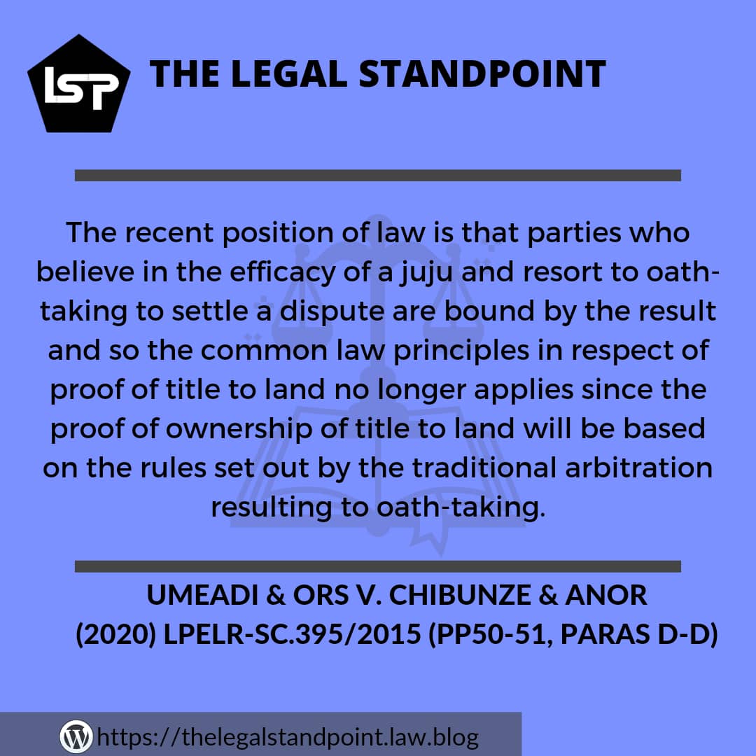 On the issue of admissibility of customary oath-taking, the Court, per Mary Peter-Odili (J.S.C) held that: I need to place on record in reiteration that where parties who believe in the efficacy of a juju resort to oath-taking to settle a dispute they are bound by the result and so the common law principles in respect of proof of title to land no longer applies since the proof of ownership of title to land will be based on the rules set out by the traditional arbitration resulting to oath-taking. See also Onyenge &Ors v Ebere & Ors (Supra).