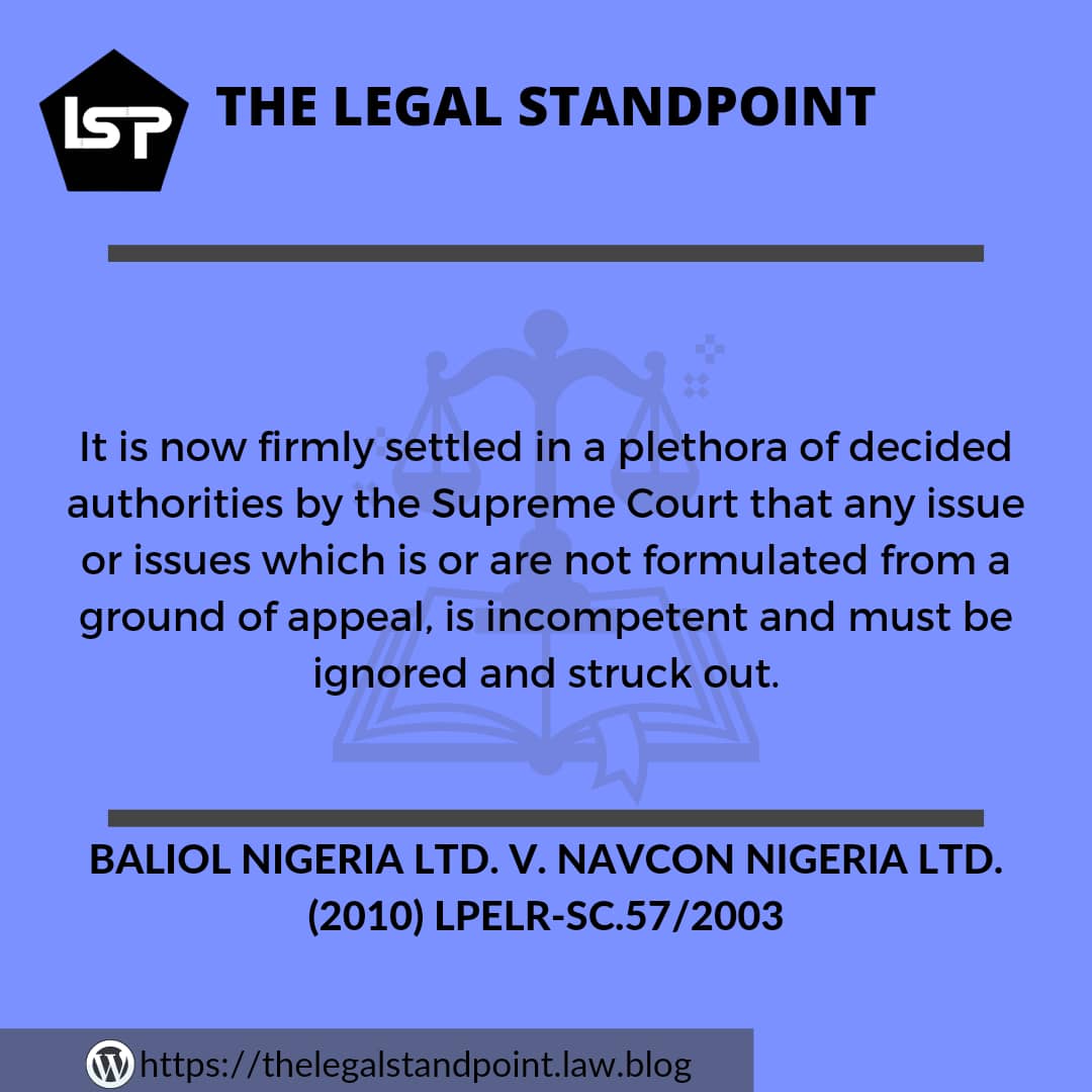 It is trite that any purported issue which has no ground of appeal to support it is incompetent. In the same vein, any ground of appeal from which no issue has been distilled and upon which no argument has been canvassed is deemed abandoned by an appellant and deserves to be struck out and should be struck out. See ODIFE & ANOR. v. ANIEMEKA& ORS.(1992) LPELR-SC.236/1988 and MADAM ALON IYOHO v. EPE EFFIONG ESQ (2007) 11 NWLR (Pt.1044) 31.