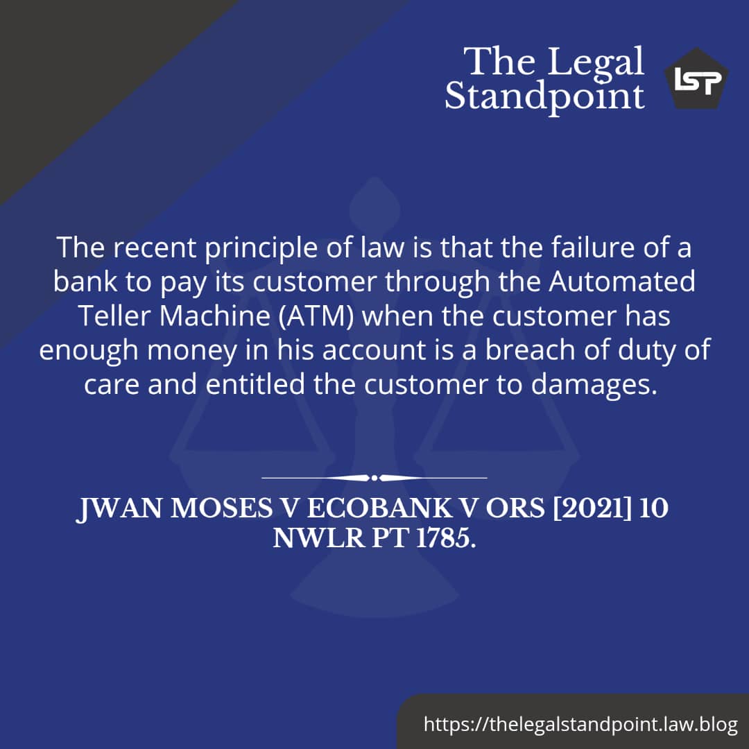 On Monday 23rd March 2020, the judicial division of the Court of Appeal in Jos gave a landmark ruling in the case of Jwan Moses v Ecobank v Ors where the Court held that the failure of the bank to pay a customer through the Automated Teller Machine (ATM) when the customer has enough money in his account is a breach of duty of care and entitled the customer to damages. The judgment was reported last week July 26, 2021, by the Nigerian Weekly Law Reports. Hence, the citation of the case Jwan Moses v Ecobank v Ors [2021] 10 NWLR pt 1785.