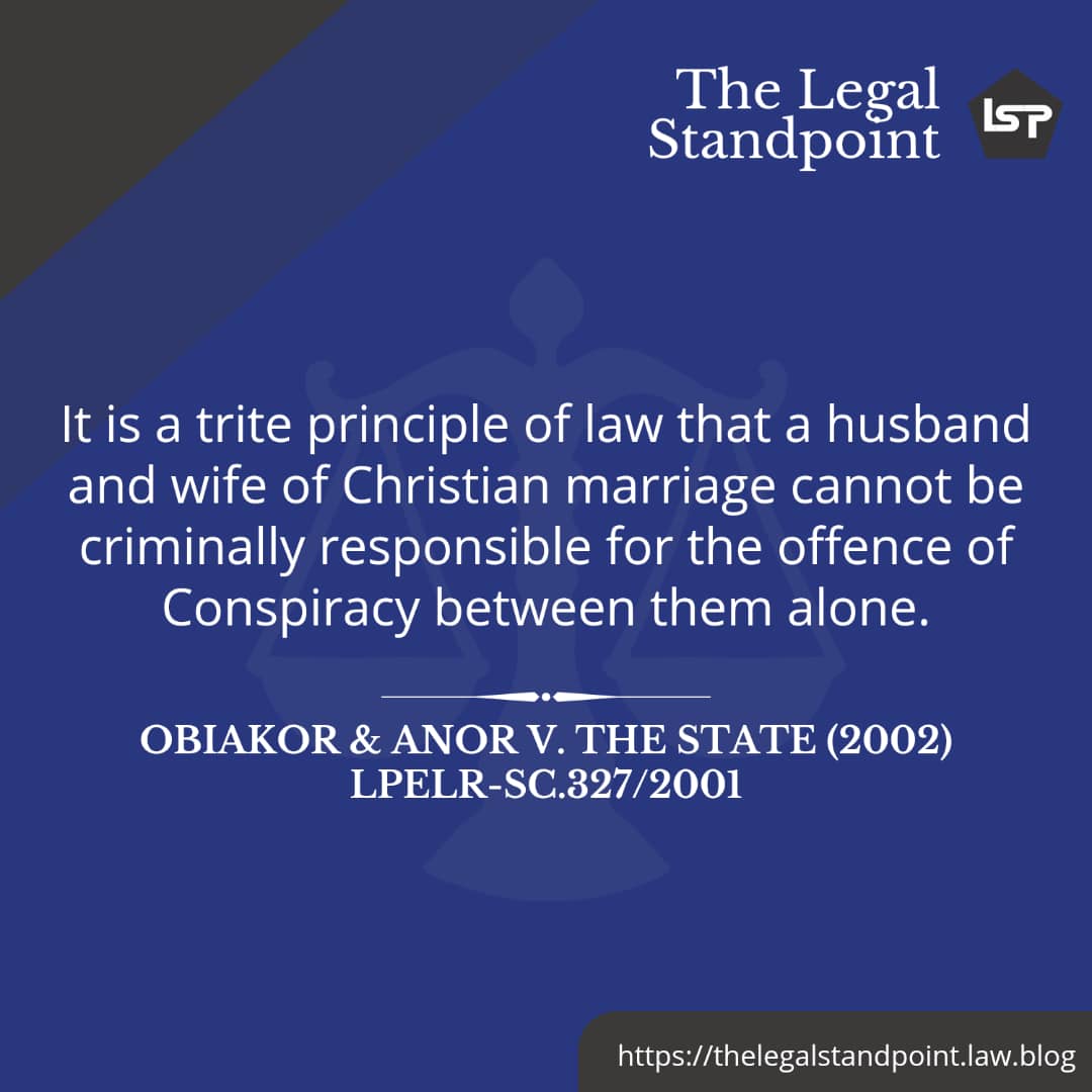 The principle that a husband and wife under a statutory marriage (Christian marriage) cannot be held guilty of conspiracy is based on the common law presumption that a husband and wife are one, each being part of the other and since conspiracy requires the agreement of at least two persons to commit an offence, such husband and wife cannot commit the offence.