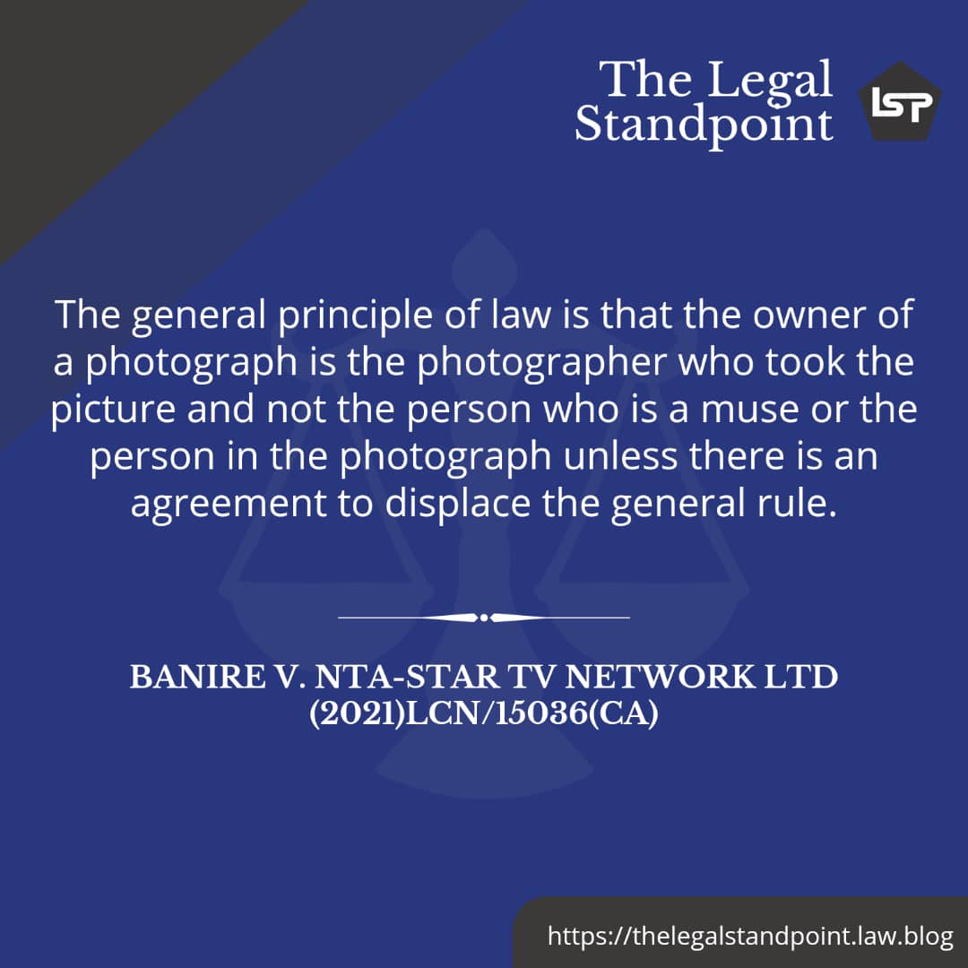 The statutory provision of sections 9 and 39 which vests the ownership of pictures on the photographer received judicial pronouncement in a recent 2021 court of Appeal case of BANIRE v. NTA-STAR TV NETWORK LTD (2021)LCN/15036(CA).