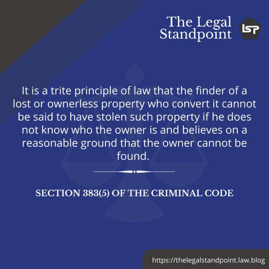 In conclusion, the principle of law under the Nigerian criminal law jurisprudence is that the finder of lost property cannot be legally considered to have stolen the property. Well, morality will agree otherwise. But this shouldn’t be a concern since morality does not win in Court.