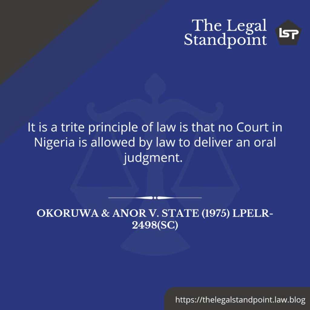 That statutory provision has been reiterated in the present section 308(1) of the Administration of Criminal Justice Act(ACJA) 2015. Also, judgment read from the note made by the judge during the trial is an oral judgment as held in Queen v Timothy Fadina (1958) 3 F.S.C. 11. Similarly, oral judgment delivered in open court by the court, and later reduced into writing in the judge’s chambers remains an oral judgment as held in State V Lopez SC.309/1967. The rationale being that the court becomes functus officio after delivering the judgment and it cannot purport to do anything to the judgment as it will amount to an irregularity. The effect of this is that the trial would be regarded as a nullity.