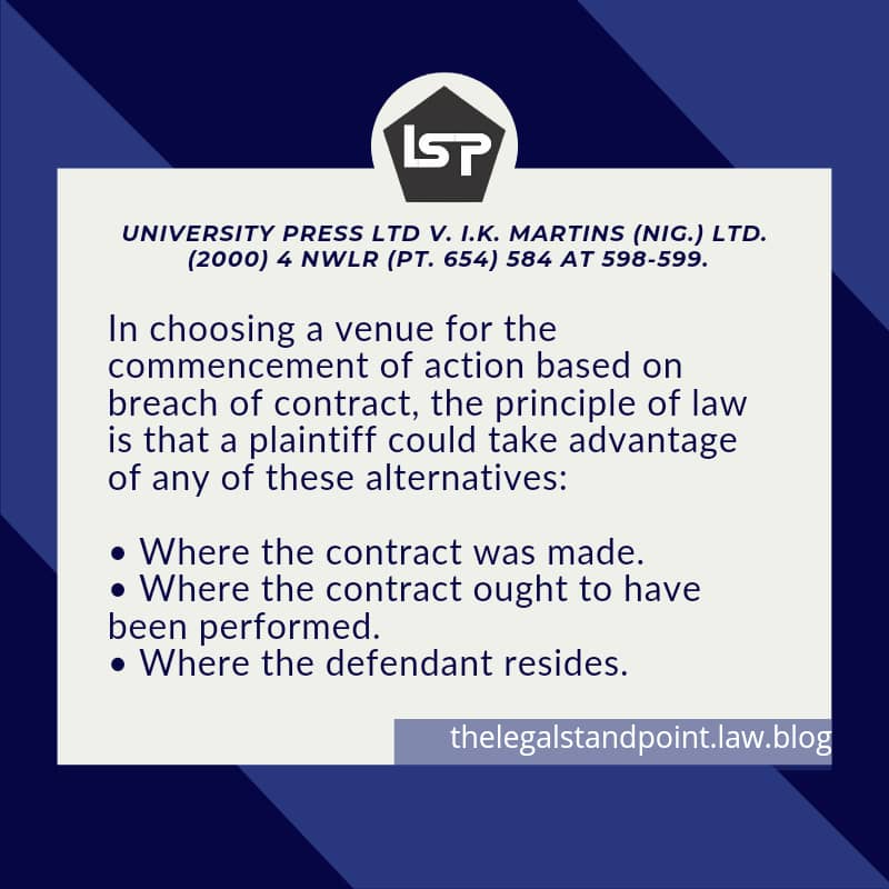 The question then becomes which venue can a plaintiff commence action for breach of contract? The principle of law as held in a plethora of cases is that the venue of action could be decided upon three alternatives, namely: