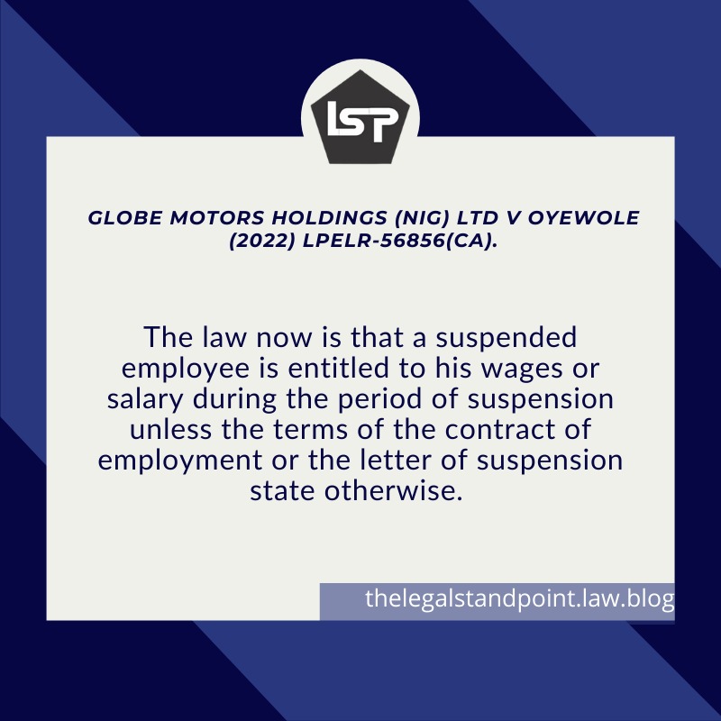 The legal question which arises is that, is a suspended employee entitled to wages during the period of suspension? This question is fundamental as it concerns the status of an employee who has been suspended from his employment either for a fixed term or indefinitely, as the Respondent in this appeal. This question came up for determination in a 2022 recent case of Globe Motors Holdings (NIG) LTD v Oyewole (2022) LPELR-56856(CA).