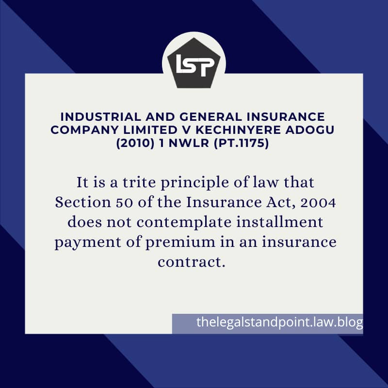 On the second standpoint, the Court was guided by the literal rule of interpretation where it held that Section 50(1) of the Insurance Act does prohibit payment of premiums in part or by installment. The court per Abba-Ajji (JCA) held that: “with respect to the learned counsel, this argument is also misconceived. If the Section intends to make payment of premium in part or by installment, it would have stated so as what is not stated, is meant to be excluded. Section 50 of the Act, therefore, does not contemplate installment payment of premium in an insurance contract.”