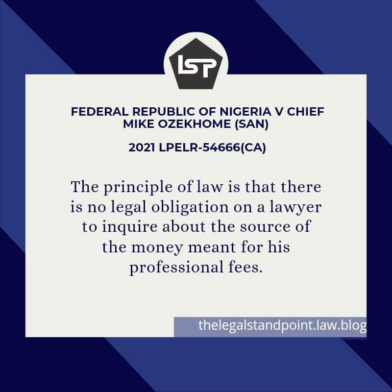 Based on this, the established principle of law is that there is no legal obligation on a lawyer to inquire about the source of the money meant for his professional fees. And it’s also immaterial that the person who made the payment was under criminal investigation.