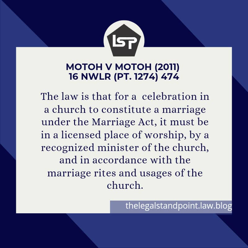 For a celebration of marriage in a church to be valid, the requirements under Section 21 of the Marriage Act must be followed. In Ijioma v Ijioma (2009) 12 NWLR (Pt. 1156) 593, the Court of Appeal listed the requirements as follows: