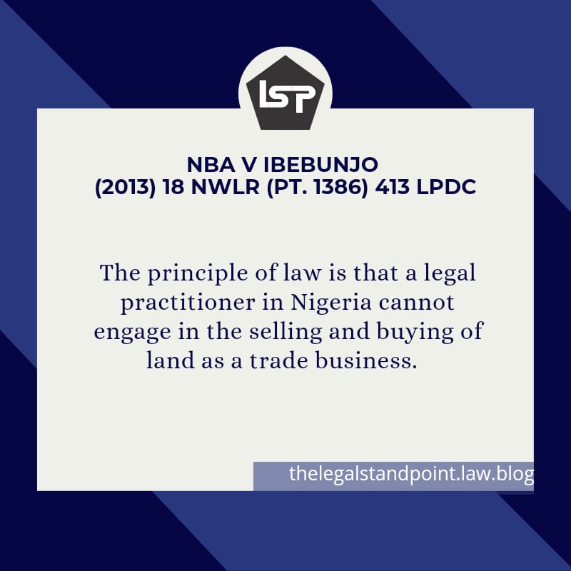 As such, the import of this decision is that a lawyer cannot concurrently practise law and also engages in buying and selling of lands as a business. You can either be one of the two upon getting called to the Bar.