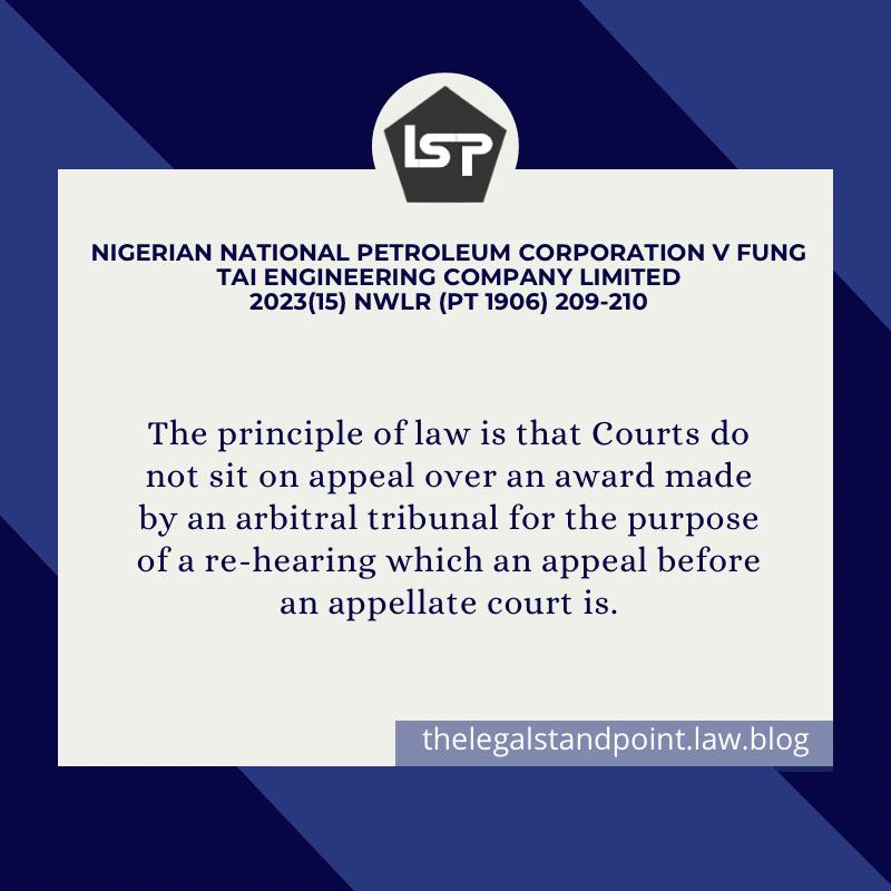 In conclusion, the principle of law is that Courts do not sit on appeal over an award made by an arbitral tribunal for the purpose of a re-hearing which an appeal before an appellate court is.