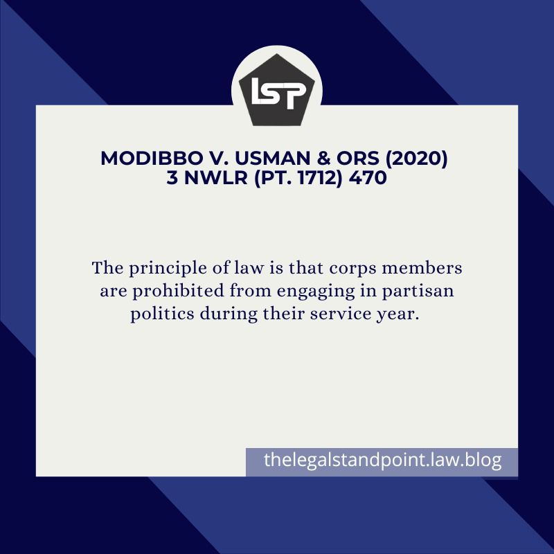 Good afternoon, Readers. Our discussion today is divided into two parts. First, we will explore whether NYSC service is compulsory for eligible graduates. Second, we will examine whether a serving corps member can participate in partisan politics. To better understand these issues, the case of Modibbo v. Usman (2020) 3 NWLR (Pt. 1712) 470 is relied upon. This issue is particularly relevant to many young Nigerians who are navigating their obligations under the NYSC scheme while considering their political ambitions.